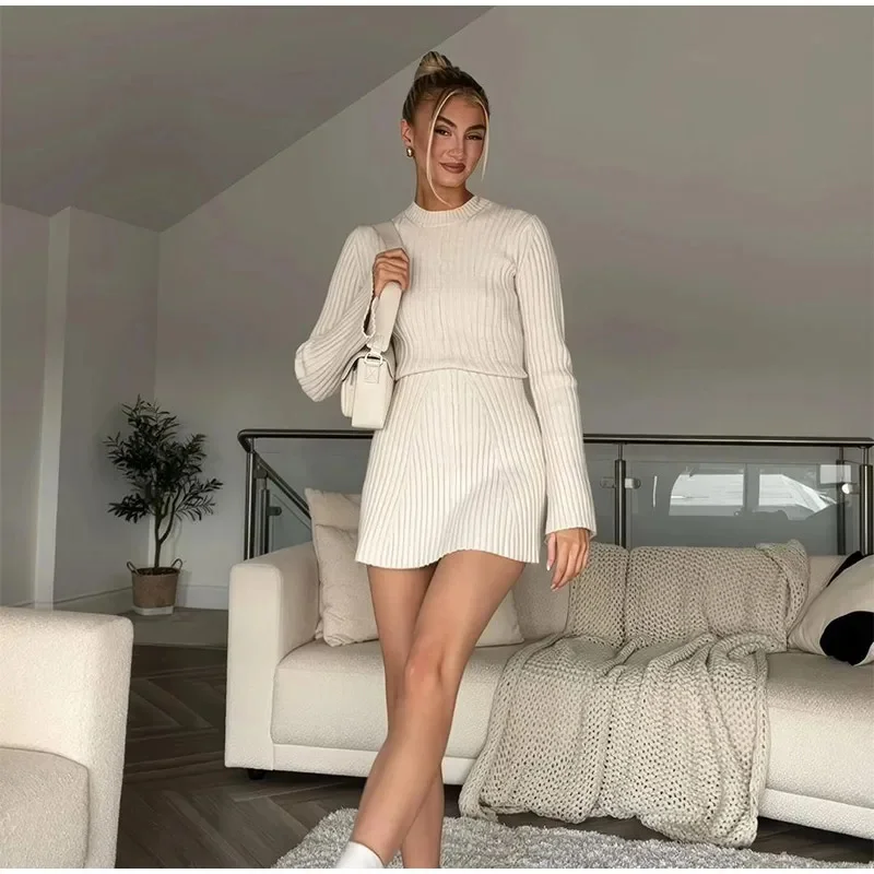 This luxurious ribbed mini dress hugs your curves with a figure-flattering fit. The textured ribs add interest, while stretchy fabric offers comfort and flexibility. Long sleeves and a round neckline provide versatile, elegant coverage.